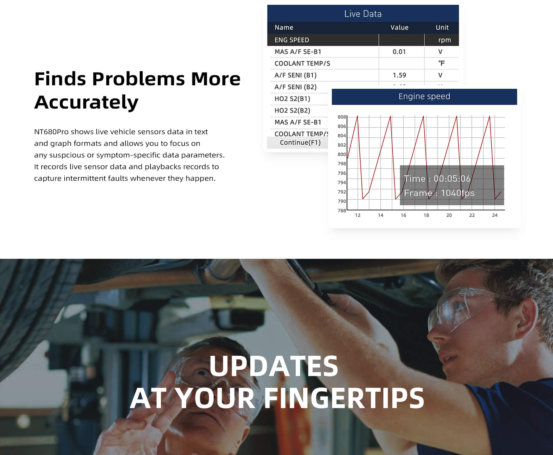 Delicately developed by the most distinguished experts of the industry, NT680Pro provides workshops, technicians and enthusiasts alike affordable diagnostic solutions. Through hardware and software upgrades, technical staff can now approach problems with greater speed and accuracy.