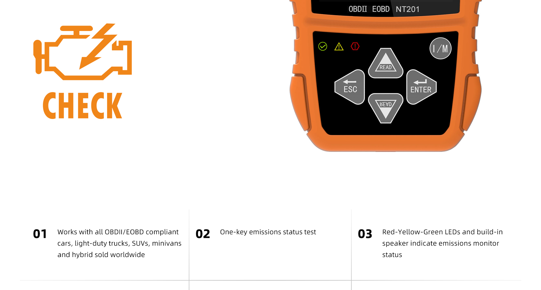 The NT201 CAN OBDII/EOBD Code Reader lets car owners troubleshoot OBDII/EOBD problems on today's vehicles easily. Its 2.4" TFT color screen and hot key for I/M test make it excellent value for money.