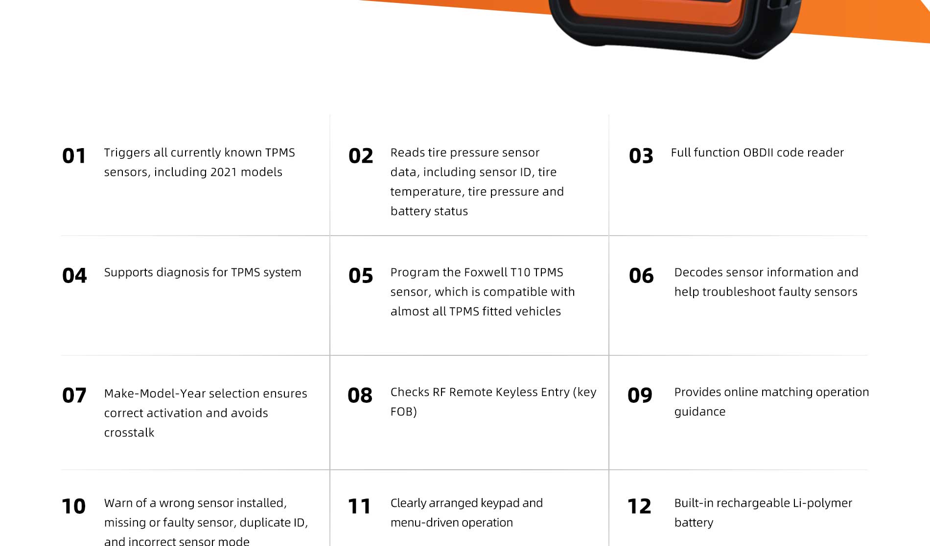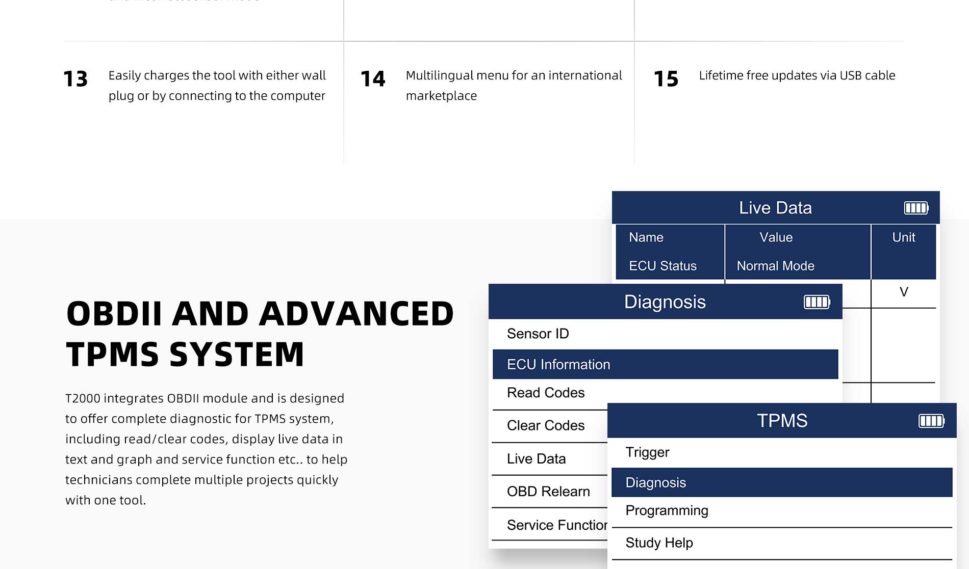 T2000 is a professional TPMS diagnostic and maintenance tool which can activate / decode universal TPMS sensors, program the T10 TPMS sensor and diagnose the original car tire pressure monitoring system. The T2000 provides a complete solution for TPMS servicing.
