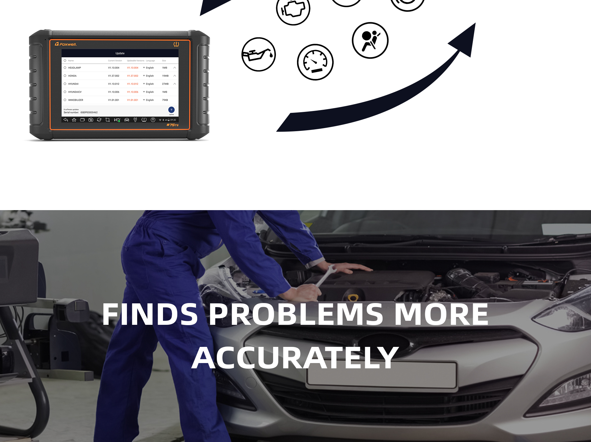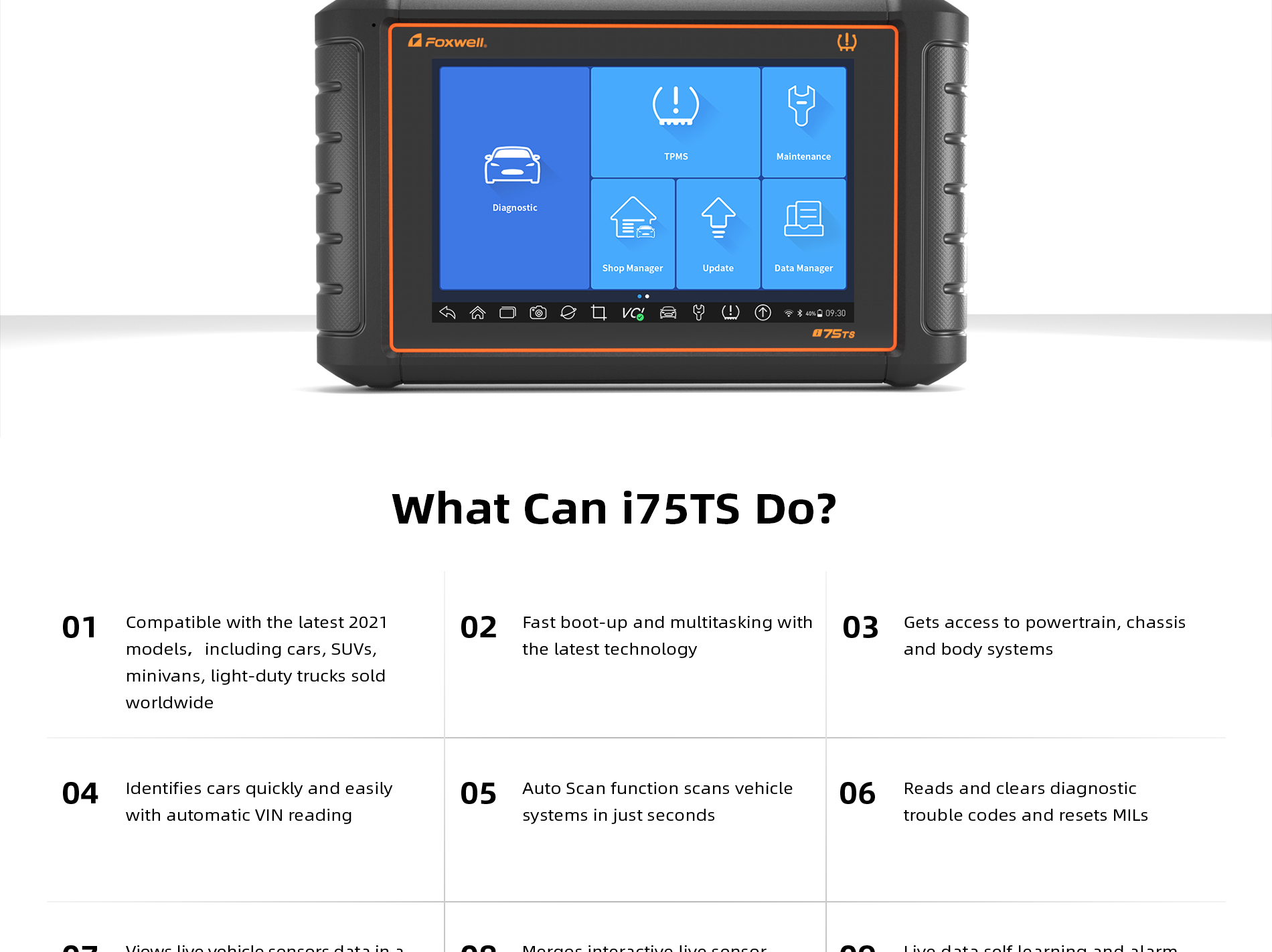 The latest tablet device i75TS stands for Foxwell new generation of intelligent diagnosis revolution in automotive aftermarkets. The device not only continues powerful OE-level diagnosis strength of Foxwell premier diagnostic platform series, but also initially integrates with TPMS service function, including TPMS health check, sensor activation & programming and TPMS relearn. It brings great convenience and efficiency for global workshops and technicians.