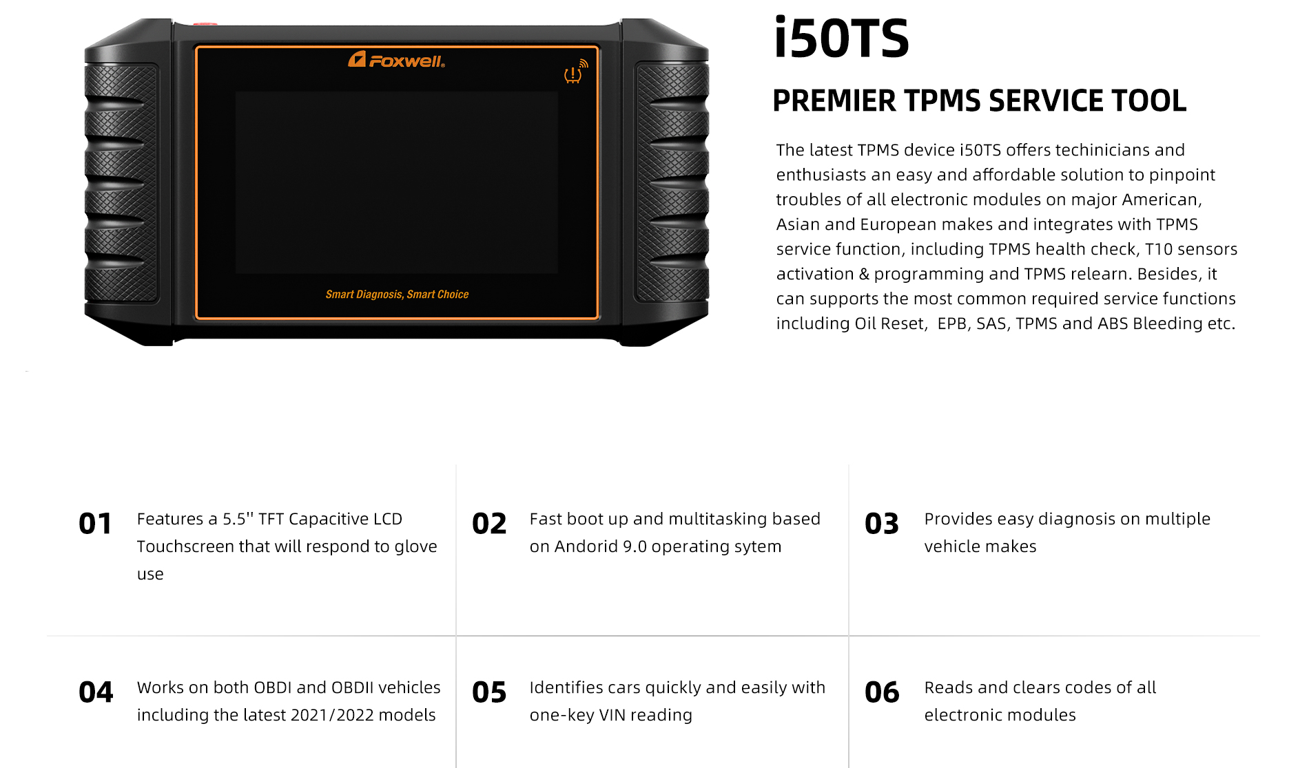 The latest TPMS device i50TS offers techinicians and enthusiasts an easy and affordable solution to pinpoint troubles of all electronic modules on major American, Asian and European makes and integrates with TPMS service function, including TPMS health check, T10 sensors activation & programming and TPMS relearn. Besides, it can supports the most common required service functions including Oil Reset, EPB, TPS, SAS, TPMS , DPF, Injector and ABS Bleeding etc.