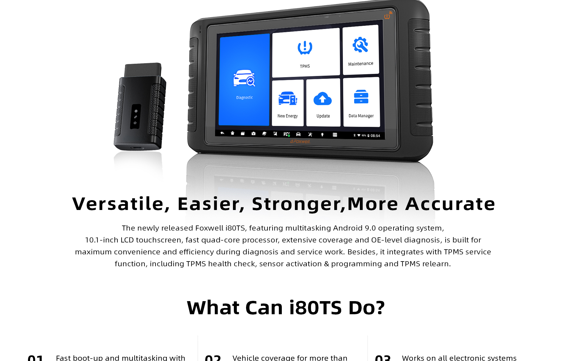 The newly released Foxwell i80TS, featuring multitasking Android 9.0 operating system, 10.1-inch LCD touchscreen, fast quad-core processor, extensive coverage and OE-level diagnosis, is built for maximum convenience and efficiency during diagnosis and service work. Besides, it integrates with TPMS service function, including TPMS health check, sensor activation & programming and TPMS relearn.