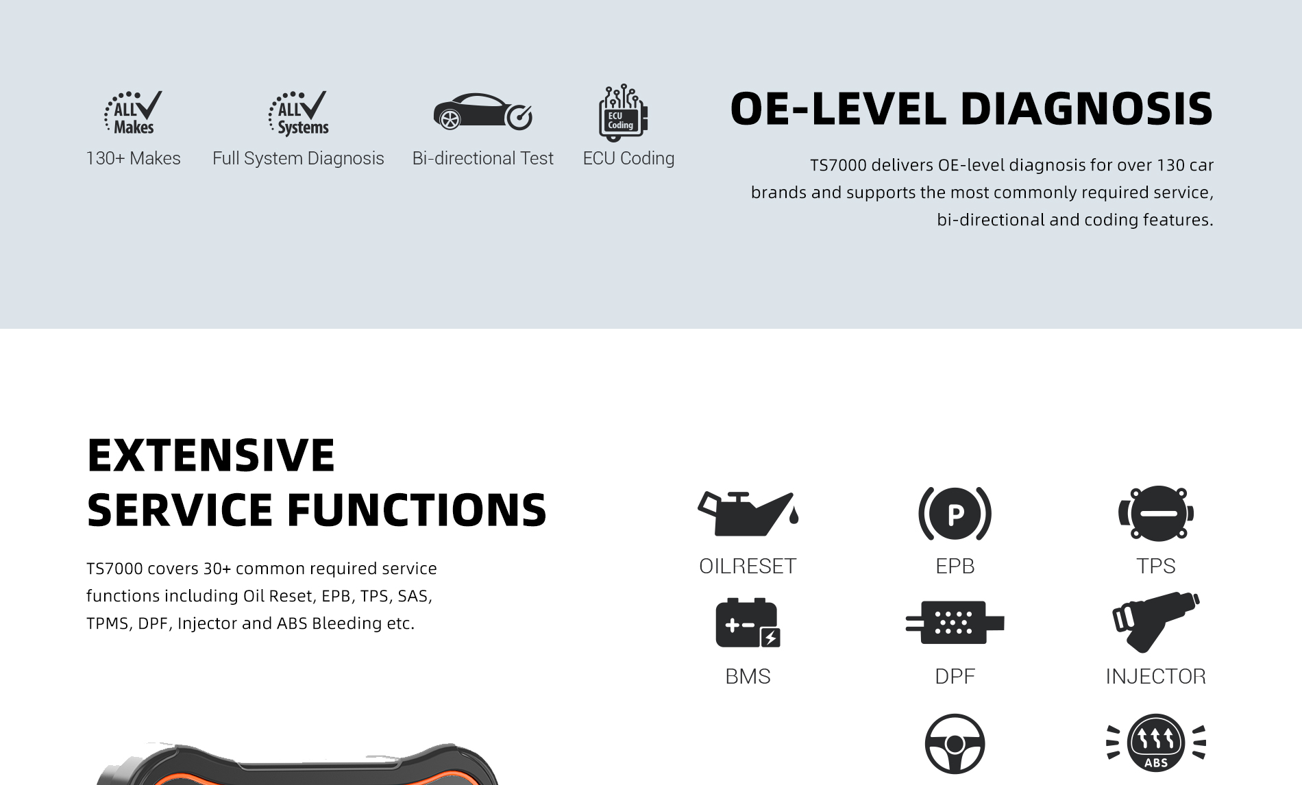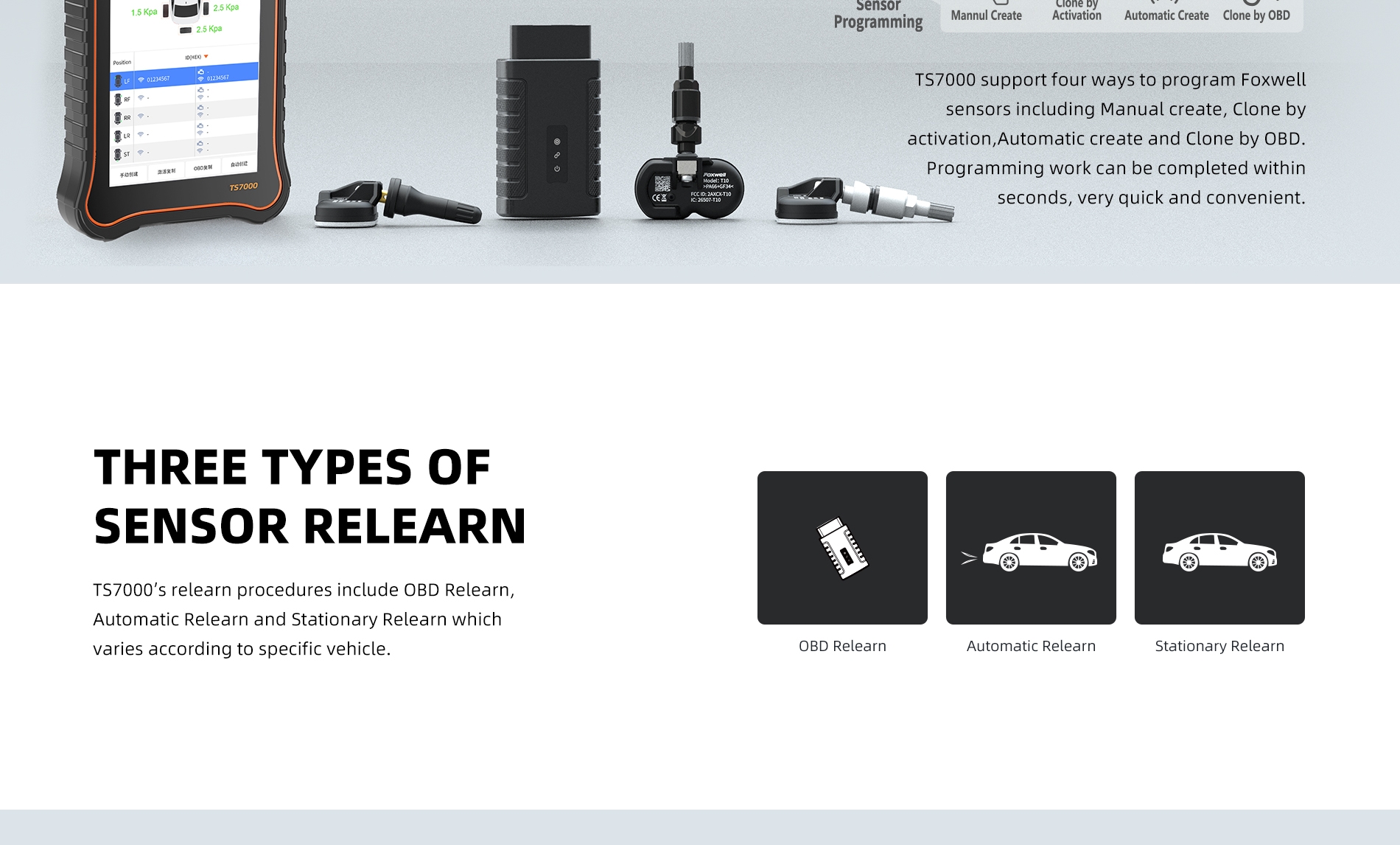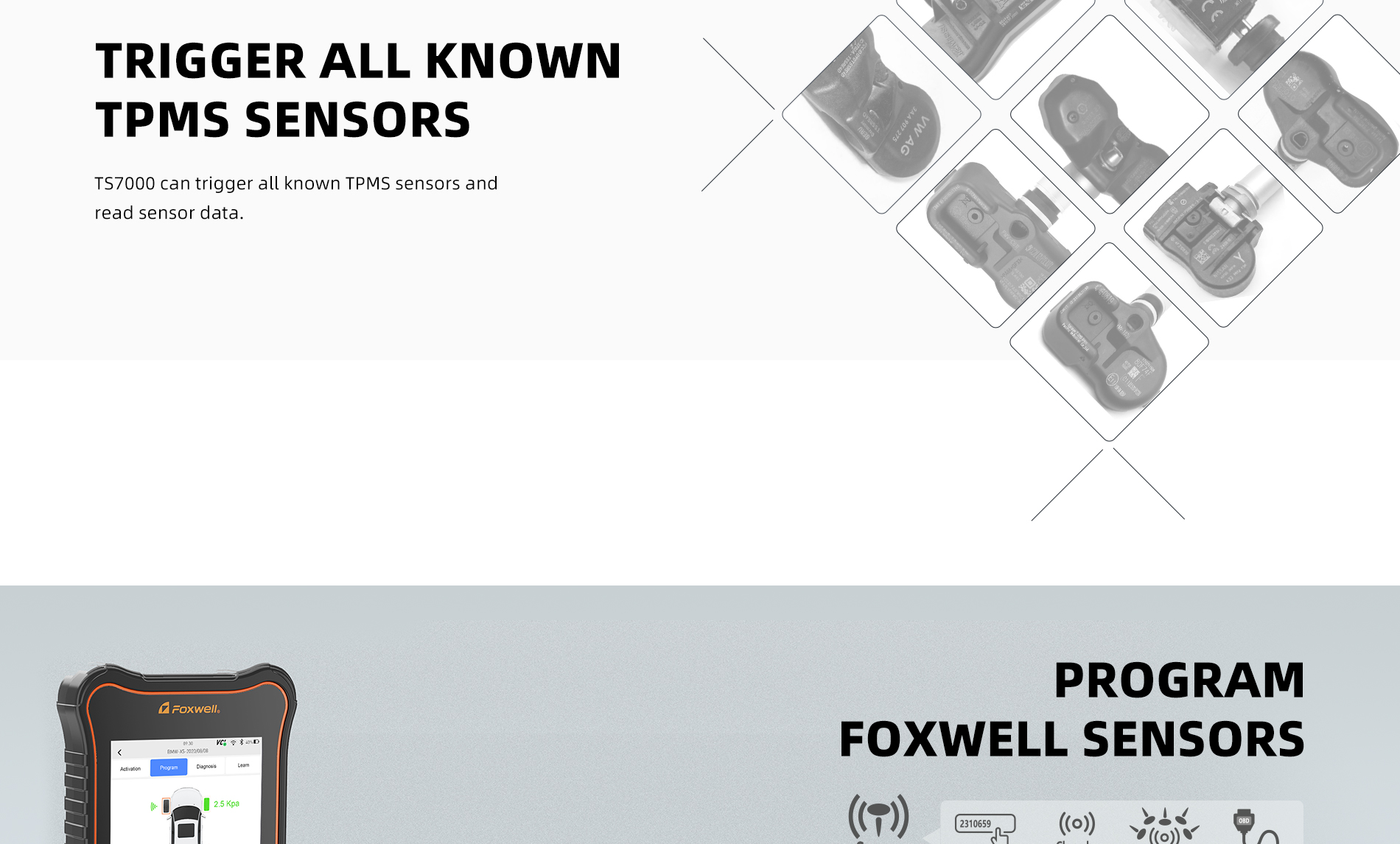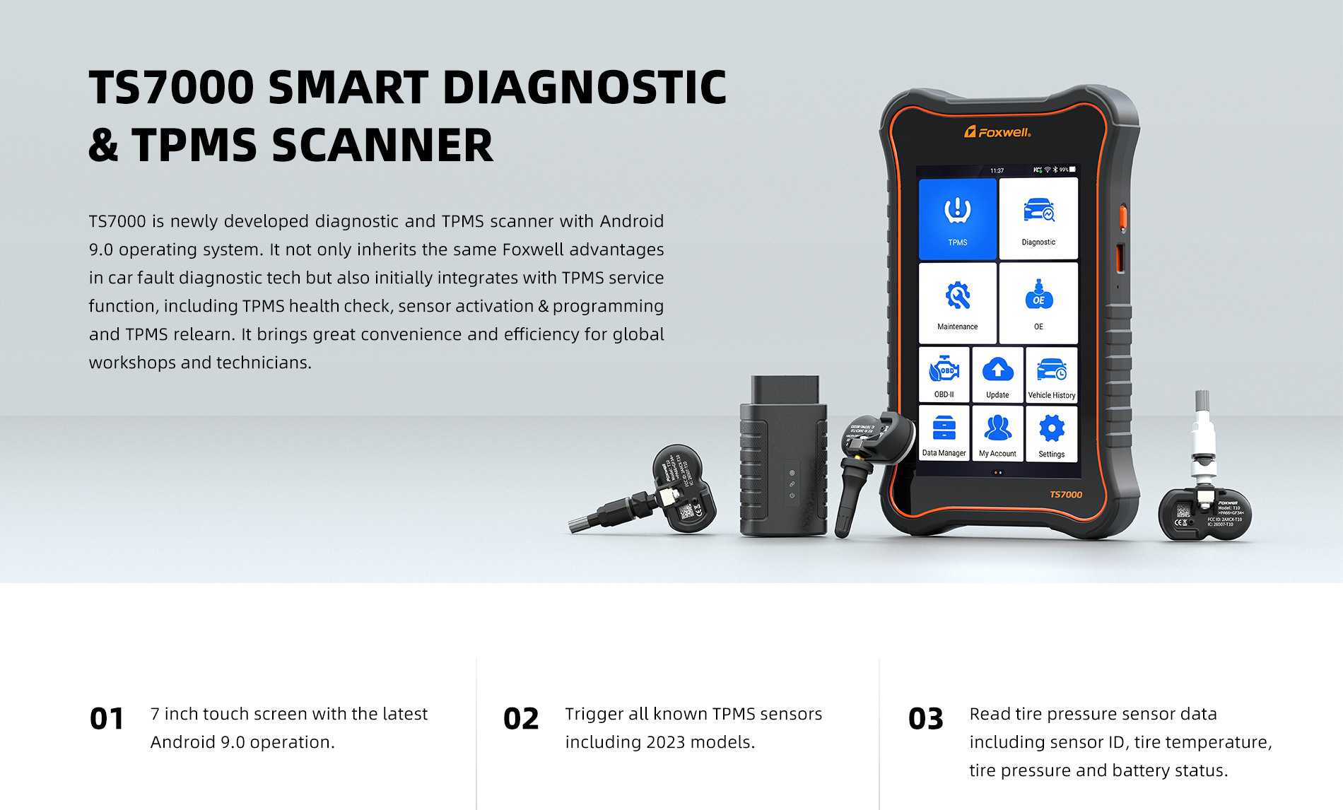 TS7000 is newly developed diagnostic and TPMS scanner with Android 9.0 operating system. It not only inherits the same Foxwell advantages in car fault diagnostic tech but also initially integrates with TPMS service function, including TPMS health check, sensor activation & programming and TPMS relearn. It brings great convenience and efficiency for global workshops and technicians.